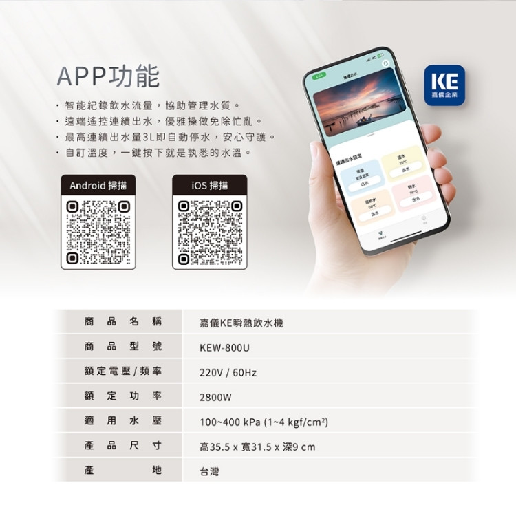 嘉儀KE 瞬熱飲水機 KEW-800U 不銹鋼/黑 (安裝費另計)